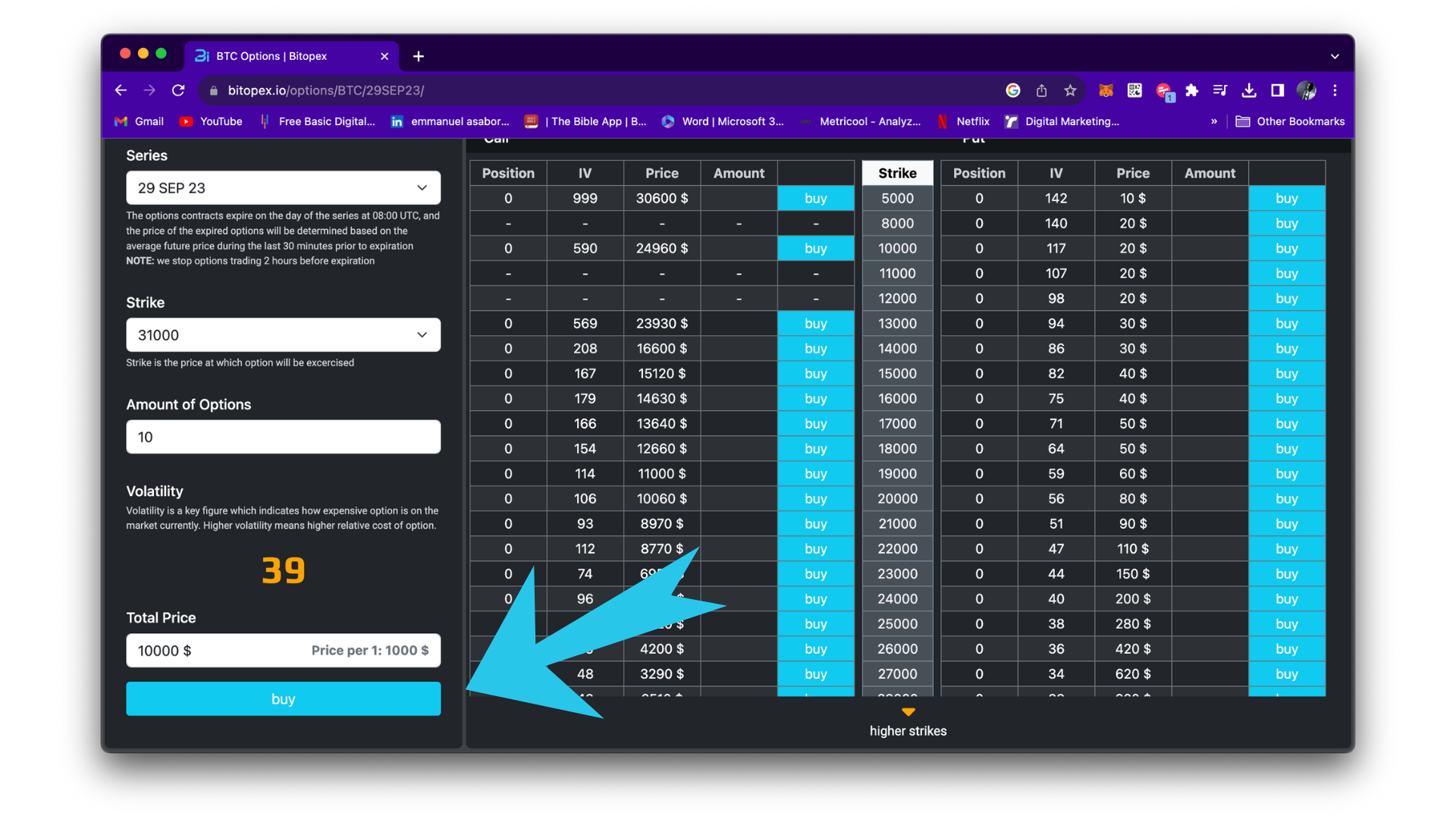 Step 3 - Set expiration date, strike price and the amount of options.